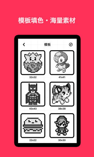 在手机上安装并打开【像素绘画】应用后,你将进入一个充满无限可能的创作世界。通过简单的点触操作,你可以在画布上自由填充像素格,创作出独具特色的像素画作品。应用还提供丰富的模板资源库,你可以下载喜欢的黑白模板,发挥色彩想象力进行填色创作。更令人兴奋的是,平台会定期推出各种主题创作活动,你可以根据活动主题创作像素画参与评选,与来自全国各地的像素艺术爱好者一较高下。