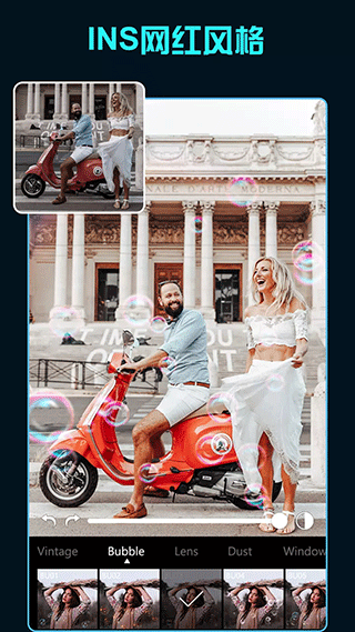 三、完美叠加 200+专业叠加素材包括光影效果、纹理贴图和艺术元素,支持混合模式自由调整。独家开发的动态光影系统可模拟自然光线变化,为静态照片注入生命力。胶片特效包完整复刻35mm电影质感,从色彩特性到颗粒结构都力求真实。