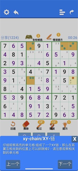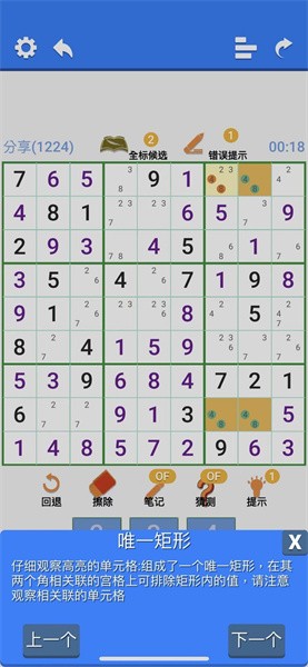 游戏采用科学的解题策略体系,从基础的排除法到高级的推理技巧应有尽有。您将学习到如何运用唯余数、行摒除、列摒除等基础方法解决简单谜题,进而掌握更复杂的x-翼、剑鱼、水母等高级技巧。游戏还特别设计了独特的"右脑训练"模式,通过视觉化提示和记忆强化训练,帮助您开发大脑潜能。每个技巧都配有详细的教学说明,让您循序渐进地提升解题能力。