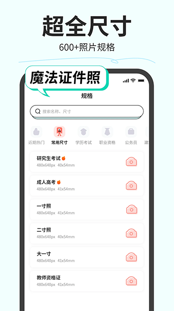 尺寸齐全:软件内置了市面上所有常见的证件照规格,包括身份证、护照、签证等标准尺寸,同时支持用户自定义尺寸设置。特别贴心地按照使用场景进行了分类,如学历考试、职业资格等,让用户能快速找到所需规格,省去繁琐的尺寸换算过程。