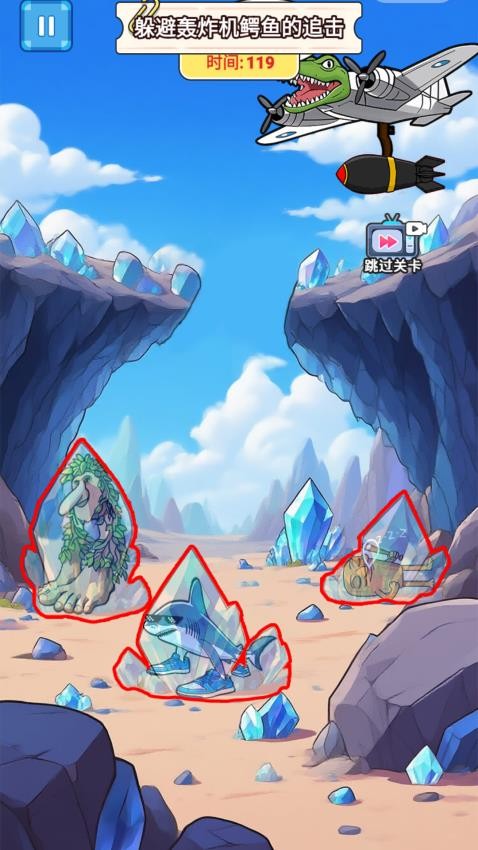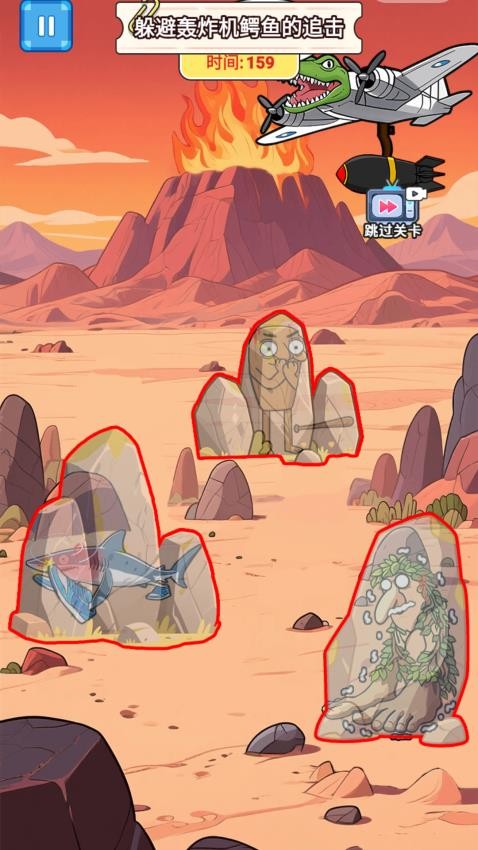 玩梗大闯关让玩家置身于极地冰原、熔岩火山与水晶峡谷等多重奇幻场景,面对空中盘旋的鳄鱼轰炸机威胁,玩家需要操控木棍人或大脚怪等角色,巧妙利用场景中的巨石与冰柱等掩体,躲避接连不断的爆炸袭击,游戏不仅考验快速反应与战术部署,还融入隐藏道具收集,保护珍稀生物,破解场景机关等丰富内容。