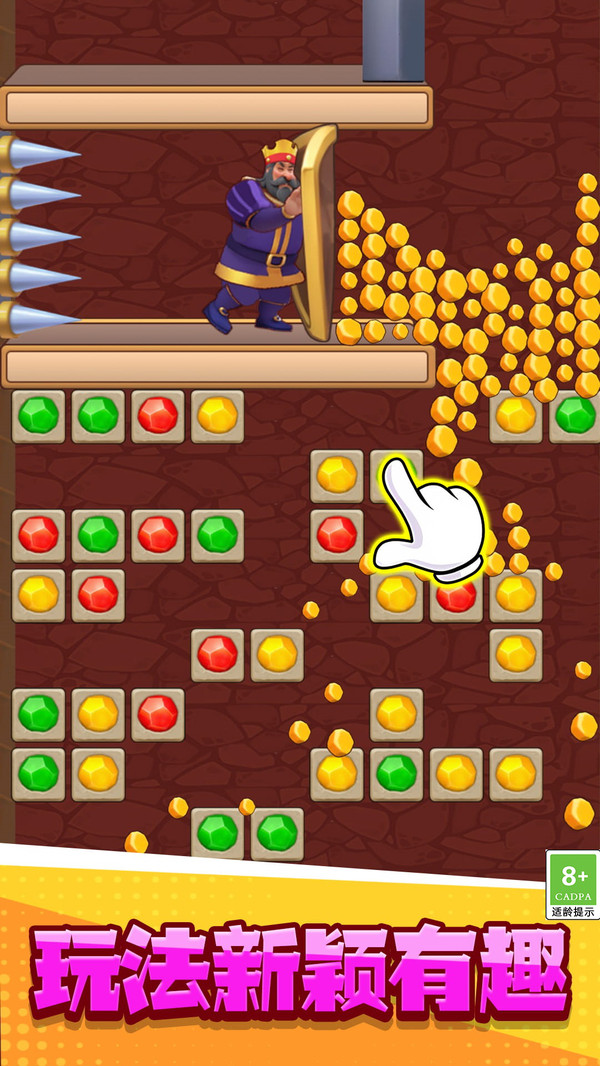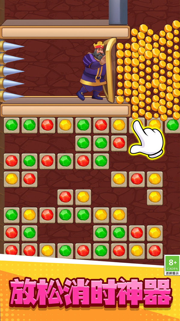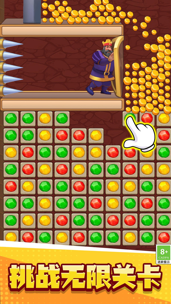 通过点击相同颜色的宝石图案进行消除,当收集到指定数量的金石头后,就能打通道路释放金币完成当前关卡目标。