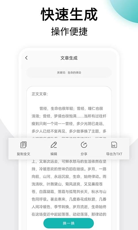 软件安装包体积小巧,不会占用过多手机存储空间,运行流畅不卡顿。智能生成引擎能够根据用户输入的主题和关键词,快速生成结构清晰、内容丰富的文章。操作界面简洁明了,一键生成功能让写作变得更加高效。无论是紧急任务还是日常创作,都能轻松应对。