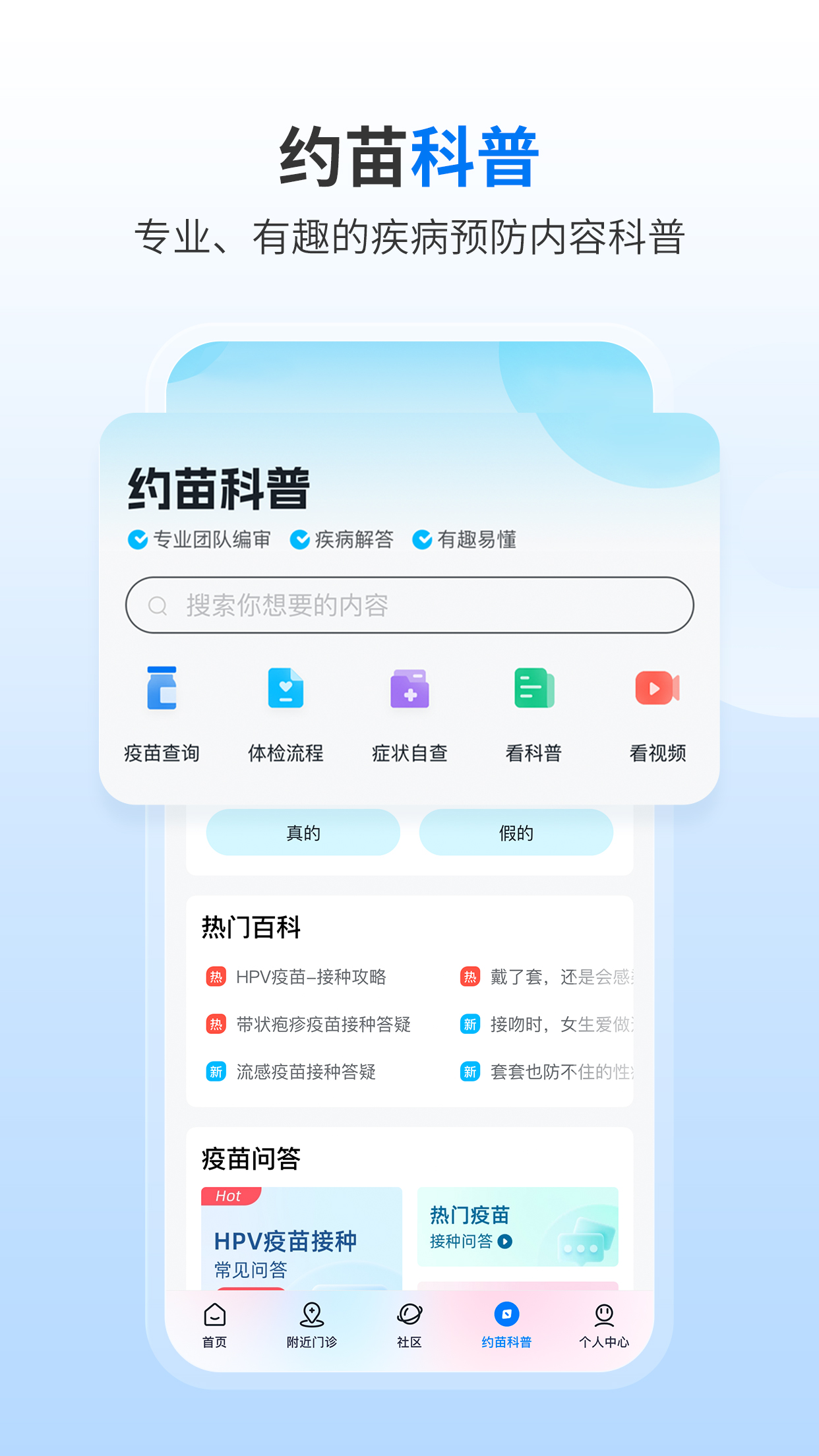 本应用程序中展示的疾病预防、预防接种等相关科普知识,仅作一般参考,不作为任何医学诊断、治疗或用药依据。平台提供的健康建议不能替代专业医疗意见,如用户出现相关症状,应及时就医。约苗建议用户在进行任何医疗决策前咨询专业医生,并以医生的诊断意见为准。平台不对用户基于平台信息做出的任何医疗决策承担责任,请用户理性看待健康信息。