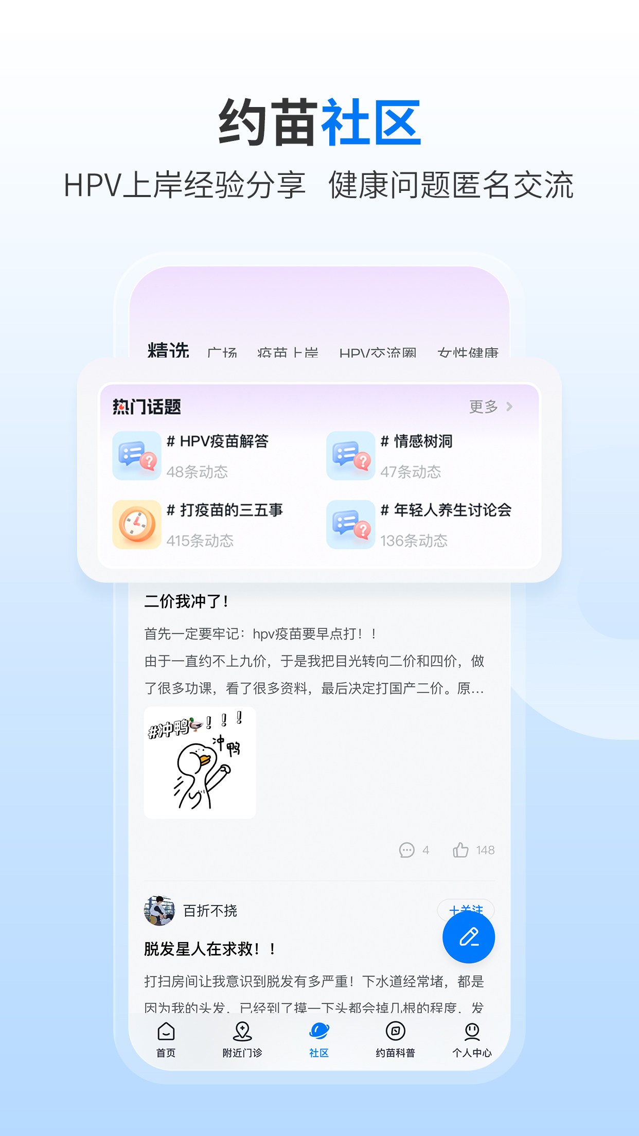 约苗社区为用户提供HPV疫苗接种经验分享、女性健康问题交流的互动平台。在这里,用户可以匿名提问,获得其他用户的真实经验分享。社区还定期邀请医疗专家进行在线答疑,解答用户关心的健康问题。通过社区交流,用户可以获取实用的健康建议,避免在健康路上走弯路。平台严格管理社区内容,确保交流环境的专业性和安全性,让每位用户都能放心分享和获取信息。