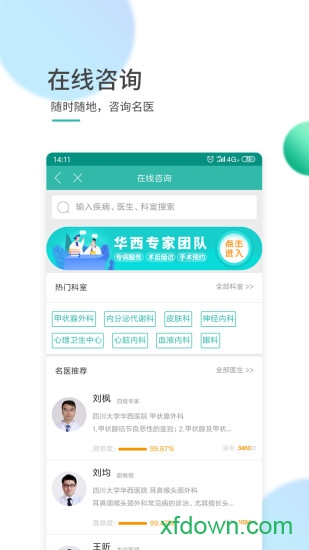 网络门诊:省去长途奔波,华西专家网络视频问诊。高清画质保证诊疗质量,电子处方直接发送至指定药房。