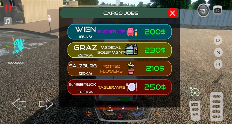选择运送的货物是游戏的重要环节。货物种类丰富多样,从普通日用品到特殊设备应有尽有。不同货物对运输要求各异,有的需要平稳驾驶,有的则有时间限制。玩家需要根据货物特性选择合适的运输路线和驾驶方式,确保货物安全送达。
