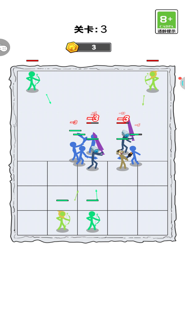 火柴布阵:玩家可召唤蓝剑士与绿弓手,根据不同战况合理安排前后排,形成稳固的攻防体系,体验烧脑又有趣的对战过程。每个单位都有独特的攻击范围和移动方式,需要仔细考虑站位才能发挥最大战力。