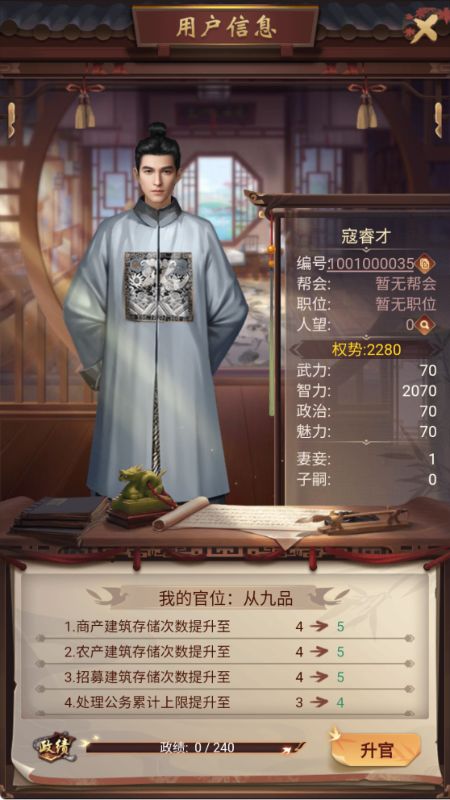 游戏的核心玩法之一是门客系统,你需要根据不同的政务需求,合理搭配门客阵容。每位门客都拥有独特的属性和技能,通过培养可以提升他们的能力。同时,你还需要处理各种政务案件,公正严明的判案不仅能获得百姓爱戴,更能积累政绩助你升迁。随着官阶提升,你将解锁更多高级玩法和特权。