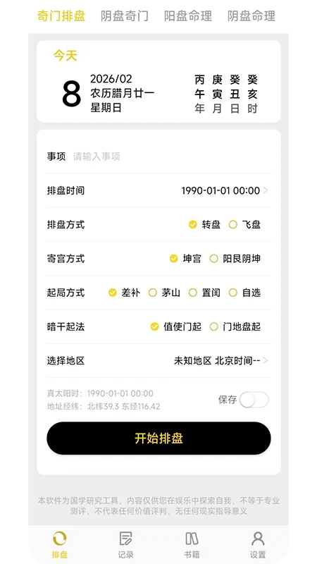 本应用专注奇门遁甲实战排盘,涵盖阴盘奇门、阳盘奇门、阴盘命理、阳盘命理完整体系,提供标准、规范、稳定的奇门排盘功能,界面直观、操作简便,满足日常学习与实战使用需求。