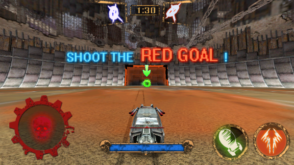 简洁直观的操作方式:通过左下角虚拟摇杆控制移动,使用装备按钮进行攻击或防御。比赛目标是在限定时间内将足球射入对方球门,当然,直接将对手车辆摧毁也是制胜之道。