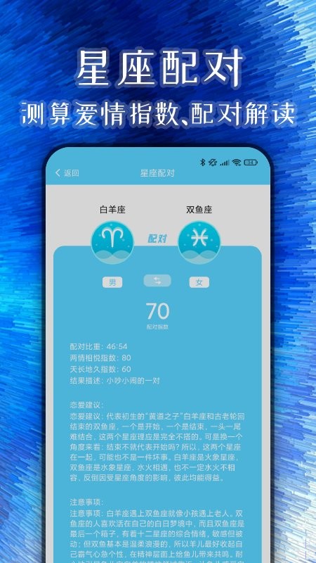 星座配对:深入分析你与伴侣的契合度,提供爱情指数评估和情感解读。