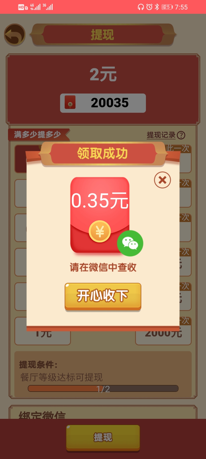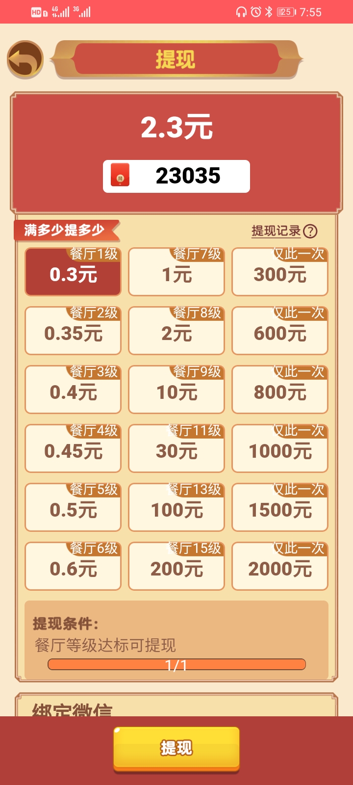 新手玩家注册即可获得0.3元奖励,将餐厅升级至一级后,可以同时接待两位顾客。操作简单直观,只需点击顾客点餐,等待他们用餐完毕即可完成服务。