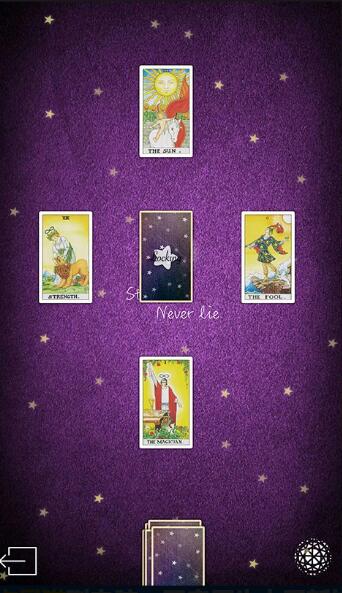 点击右下角的"塔罗、雷诺曼、神谕卡"选项进入抽牌界面。在塔罗牌页面,将卡牌滑动到空白区域,选择一定数量的牌后点击查看。翻开卡牌后,软件会详细解读每张牌的含义及其预示。