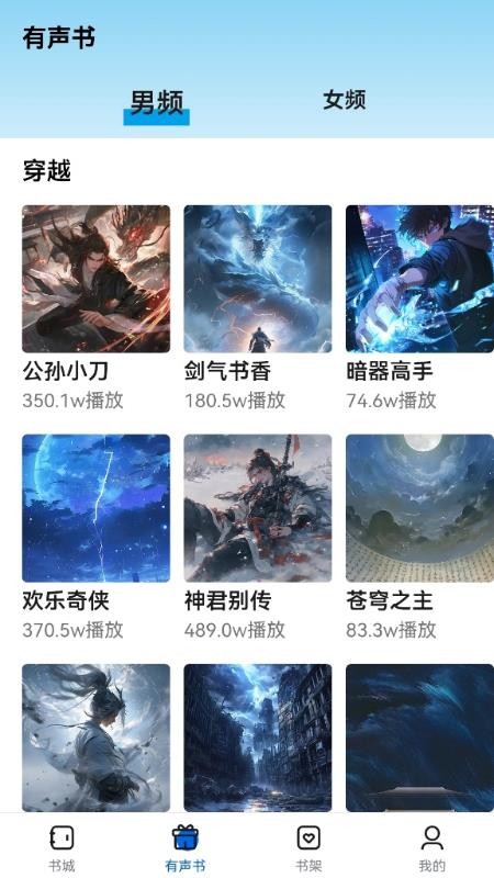 切换至有声书专区,在男频分类中找到穿越题材作品,轻点封面即可开始收听。