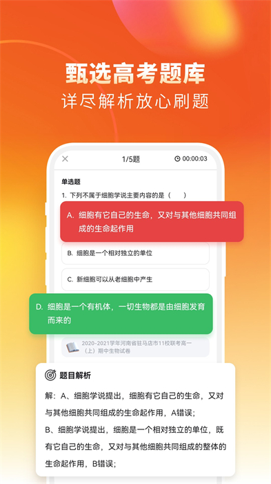 软件精心收录了历年高考生物高频考点和典型题型,涵盖细胞生物学、遗传学、生态学等各大知识模块。每道题目都配有专业详细的解析过程,帮助学生深入理解解题思路。同时系统会根据用户答题情况智能推荐薄弱环节的专项训练,确保重点难点各个击破,为高考做好充分准备。