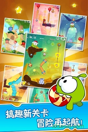 切割绳子:通过精准的触控操作切割各种材质和长度的绳子,利用物理特性让糖果顺利到达OmNom口中。