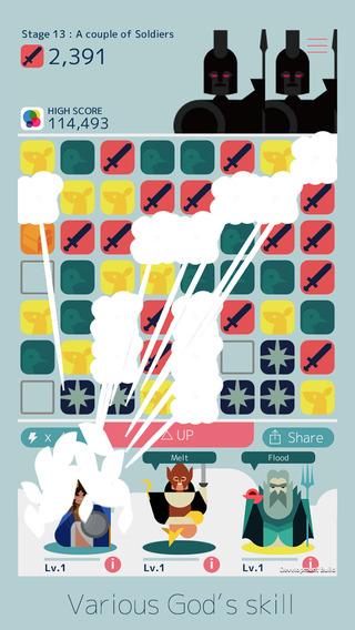 游戏操作简单直观但策略丰富:长按三个以上相邻的同色剑形瓷砖即可收集它们。收集的瓷砖数量越多,攻击力加成就越显著。当成功排列三个以上剑形瓷砖后,轻触屏幕就能发动强力攻击,对怪物造成毁灭性打击。随着游戏进程,玩家将面对来自希腊神话的各种经典怪物,从独眼巨人到美杜莎,每个怪物都有独特的攻击方式和弱点。游戏还设有连击系统,连续消除可以触发特殊效果,比如范围攻击或额外奖励。合理规划每一步消除,才能在面对强大的神话生物时立于不败之地。