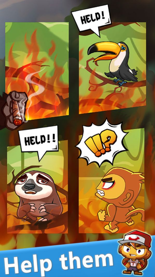 游戏背景设定在神秘的亚马逊雨林,猴子的家园遭到大火破坏,玩家需要通过冒险来重建家园;