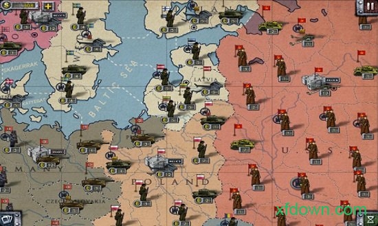 游戏配乐气势恢宏,极具代入感,完美烘托出战争的紧张氛围。主要国家都拥有独特的战略卡片系统:德国"闪电突击"可将普通士兵瞬间升级为坦克部队;意大利"海洋集结"能在海域领地快速增援30个步兵单位;英国"SAS奇袭"支持在指定区域空投35个精锐步兵;苏联"红色风暴"可为所有己方领地增加5个步兵单位;法国"精英训练"则能让所有部队获得将军、元帅级别的强化卡牌。这些特色系统大大丰富了游戏的战术可能性,让每场战役都充满变数和挑战。