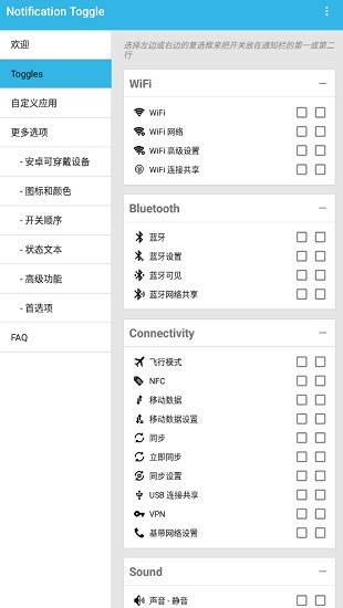 NotificationToggle提供了极其丰富的快捷功能选项,几乎涵盖了所有常用的系统设置。网络方面支持WiFi、蓝牙、移动数据和飞行模式的快速切换;声音控制包括静音、振动和音量调节;显示设置则包含亮度多级调节和屏幕超时设置。此外还支持NFC、GPS等高级功能的快捷开关。对于音乐爱好者,提供了播放控制功能;摄影爱好者则可以快速启动相机。特别值得一提的是,软件还支持壁纸更换、锁屏等特殊功能(需配合其他应用使用),甚至可以通过root权限实现关机重启等高级操作。通过应用内购买,用户还能添加自定义应用程序的快捷方式,真正实现通知栏的全面掌控。