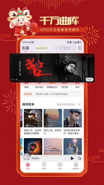 【时尚的界面设计】:采用简约大气的UI设计,整合精品推荐、每日歌单、热门排行等功能模块,让您轻松发现心仪音乐。【百万正版曲库】:收录环球、索尼、华纳等唱片公司授权的百万正版音乐资源,支持高清无损音质下载。【万首独家MV】:独家呈现三大唱片公司授权的音乐视频,带来视觉与听觉的双重享受。【打造专属音乐空间】:支持创建个性化歌单、收藏喜爱歌曲、关注心仪歌手,打造专属音乐天地。【便捷分享功能】:一键将好音乐分享至社交平台,与好友共享音乐心情。【智能音乐推荐】:基于用户喜好创建个性化电台,提供单曲循环、歌词分享等贴心功能。