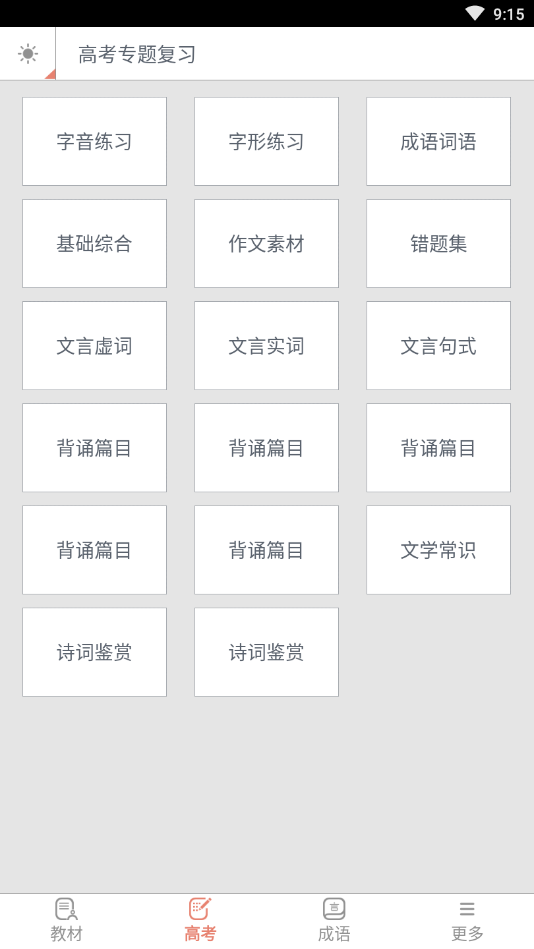 (4)高考专题复习。软件提供全面的高考复习资料,涵盖文言文实词、虚词、句式讲解,以及字音、字形、标点符号使用、病句修改等专题训练。同时汇总高考必背篇目,帮助学生系统复习,轻松应对高考。