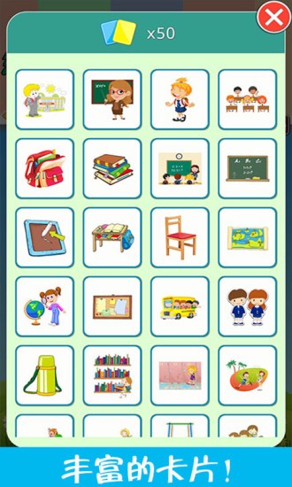 游戏内置超过50种精美卡牌,每张卡牌都经过专业设计,色彩鲜艳、形象生动,能有效吸引孩子的注意力。游戏采用渐进式难度设计,让孩子在完成简单任务后获得成就感,再逐步挑战更高难度。三种游戏模式(简单、中等、困难)可以自由切换,建议初次接触的孩子从基础模式开始,随着能力提升逐步增加难度,这样既能保持兴趣又能获得持续进步。