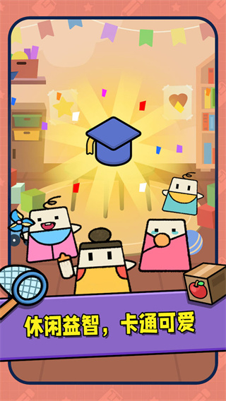 三个二号学生合成之后就会获得一个三号学生,获得六个三号学生即可通过关卡,但是游玩过程中要小心会有小狗来捣乱偷吃苹果食物。游戏设置了多种障碍机制,需要玩家灵活应对,制定合理的合成策略才能顺利通关。