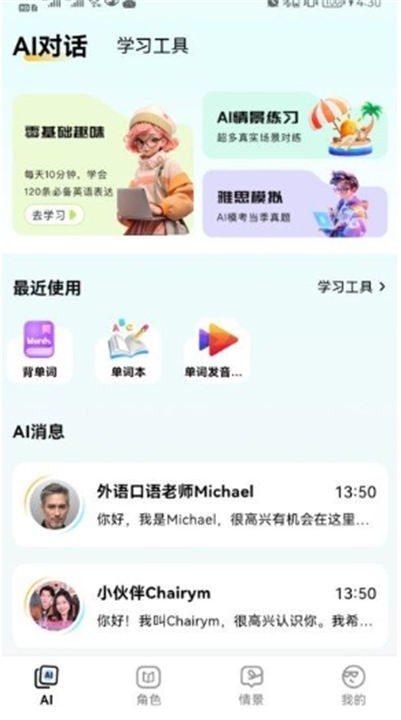 用户进入软件之后需要先进行登录,支持手机号、微信等多种快捷登录方式。用户登录之后就可以来到首页,首页有着AI对话和学习工具两个选择,AI对话可以进行口语模拟练习,系统会根据用户的发音准确度给出实时评分和建议。用户在学习工具里可以练习单词发音和听写等,每个单词都配有标准发音示范和例句解析。软件还拥有专业的外语老师教用户学习英语的技巧,定期更新实用口语表达和发音要领。