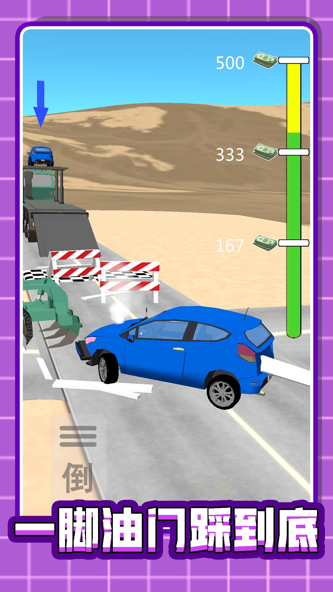 游戏的玩法设计极具创意且充满挑战性。在通往终点的道路上,你需要面对各种精心设计的障碍物和致命陷阱,这些障碍不仅考验你的反应速度,更考验你的驾驶技巧和策略思维。无论是突如其来的路障、变幻莫测的弯道,还是隐藏的陷阱,都需要你全神贯注地应对。特别值得一提的是,游戏加入了逼真的漂移系统,让你可以像专业赛车手一样,在急转弯时做出华丽的漂移动作,感受轮胎与地面摩擦带来的快感。