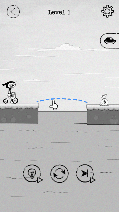 下载安装后进入游戏,首先会看到简洁的黑白手绘风格界面。游戏提供了详细的新手教程,玩家可以学习如何绘制有效的通行路线。在关卡中,玩家需要用手指在屏幕上绘制线条,这些线条会变成桥梁、斜坡等道具,帮助主角的车辆顺利通过障碍。随着游戏进程,会出现更多复杂的地形和机关,需要玩家灵活运用各种绘制技巧。成功让车辆到达终点后,系统会根据路线设计的巧妙程度给予星级评价。